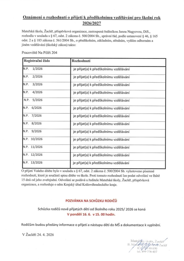 Řádně vyplněnou „Žádost k přijetí dítěte do MŠ”