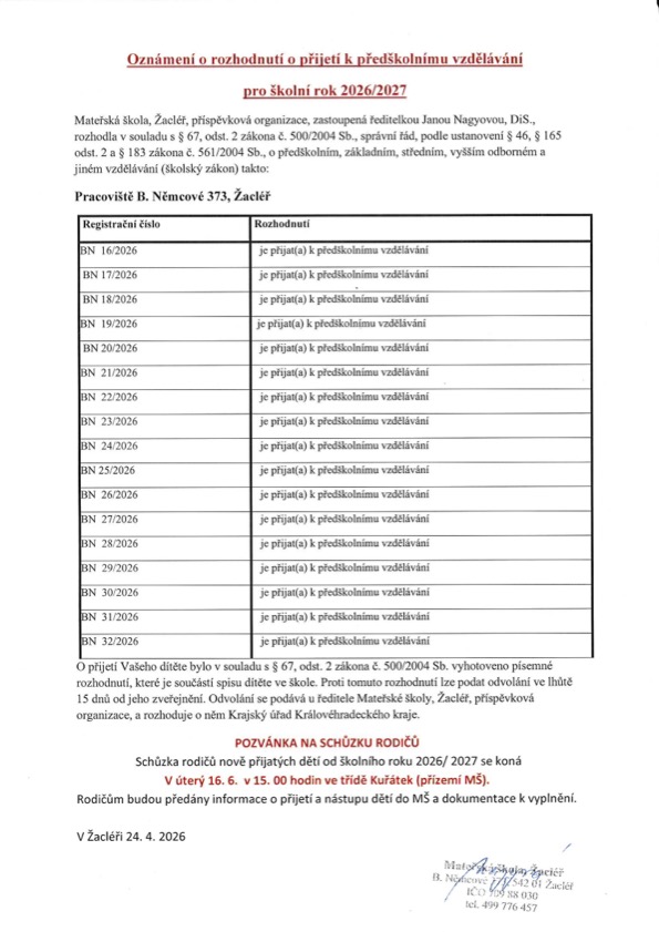 Řádně vyplněnou „Žádost k přijetí dítěte do MŠ”